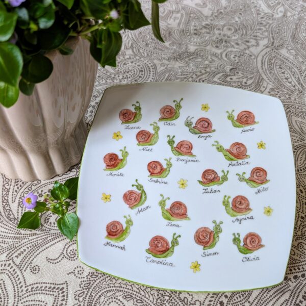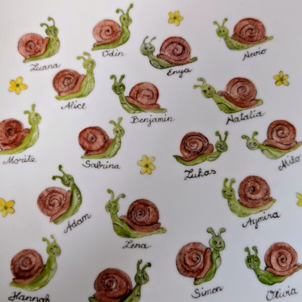 Besonders beliebt ist zum Beispiel das Design mit kleinen Schnecken oder Schildkröten, jede versehen mit dem Namen eines Kindes der Schnecken- bzw. Schildkrötenklasse – ein wunderschönes, bleibendes Andenken.