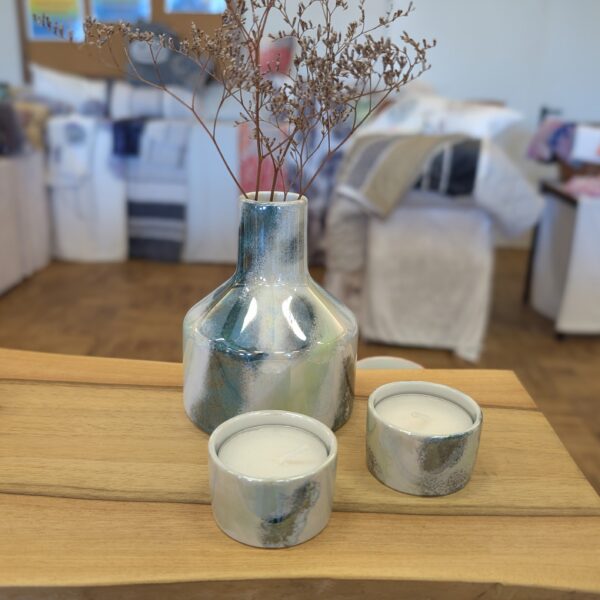 Ein kleines Spiel aus Licht und Farbe: Diese handbemalte Vase mit zwei passenden Teelichthaltern verbindet modernes Design mit lebendiger Ausstrahlung. Schimmernde Lüsterfarben verlaufen sanft von zartem Hellgrün bis hin zu tiefem, sattem Grün und erzeugen je nach Blickwinkel ein faszinierendes, irisierendes Leuchten.