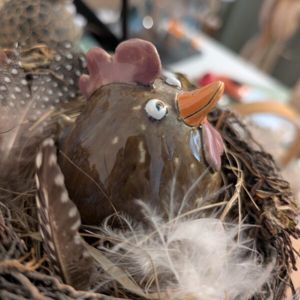 Dieses liebevoll handgefertigte Keramik-Huhn in kugelrunder Form begeistert mit seinem natürlichen braunen Farbspiel und seinen lustigen Augen, die jedem Betrachter ein Lächeln entlocken. Ob als fröhlicher Blickfang im Wohnzimmer, auf der Fensterbank oder als originelles Ostergeschenk – dieses charmante Unikat bringt garantiert gute Laune in jedes Zuhause.
