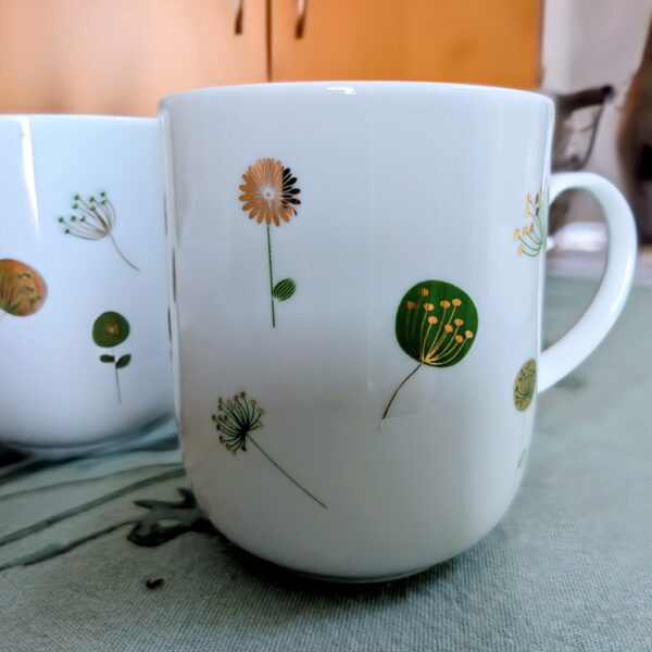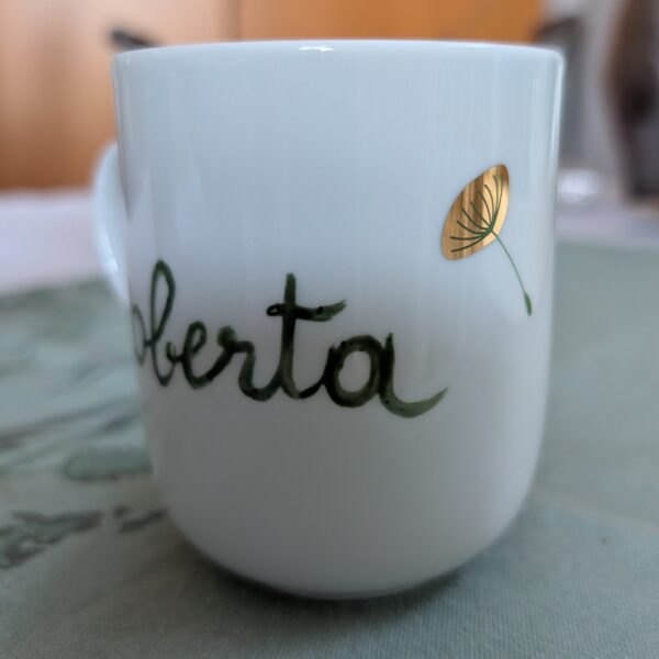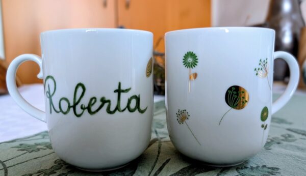 Diese liebevoll handbemalte Tasse besticht durch ein elegantes Streublumen-Design in dunkelgrünen Farbtönen, veredelt mit goldenen Akzenten. Jede Tasse ist ein Unikat und wird mit viel Sorgfalt von Hand gestaltet.