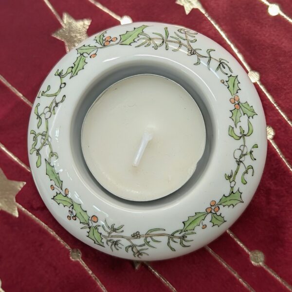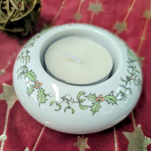 Dieser liebevoll handbemalte Porzellan-Teelichthalter bringt festlichen Glanz und natürliche Wärme in die Winterzeit.